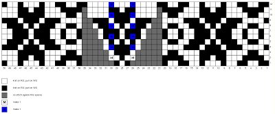 Næste omg.: * Strik 11 m r, strik 2 m r sm *, gentag fra *-* omg rundt.